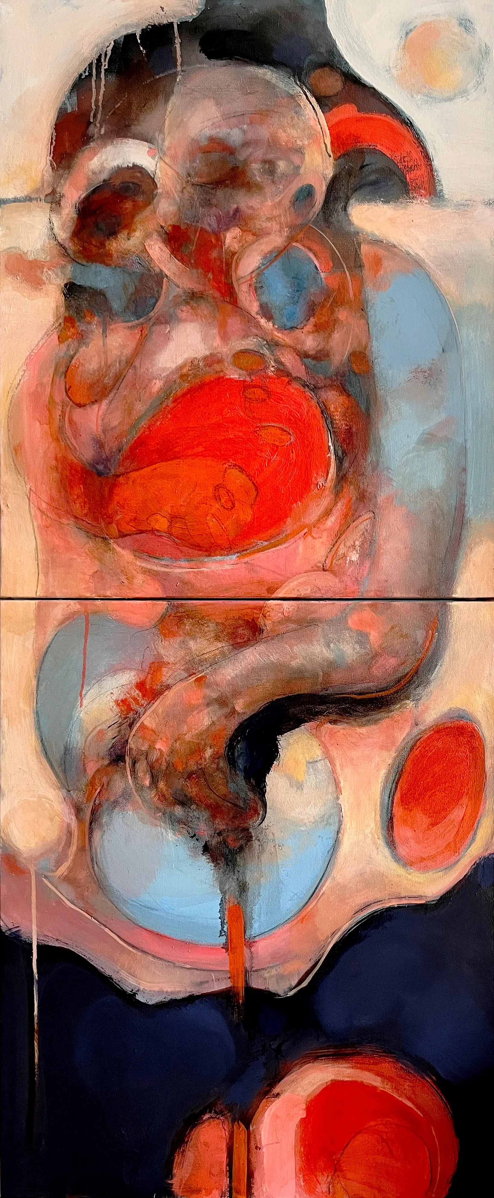 Robin McCoy is an expressionist painter based in Asheville, North Carolina, whose visceral, large-scale oil paintings immerse viewers in a primordial beauty. Born in Charleston, SC, and trained in commercial graphic arts at Savannah College of Art & Design, McCoy broke away from formal constraints to pursue a raw, improvisational practice rooted in the traditions of postwar abstract expressionism and figurative distortion. His paintings feature tangled human and animal forms dissolving into abstract shapes, where the boundary between figure and environment blurs, evoking a sense of primal chaos. What emerges is not mere disorder, but a dark sensuality—a luscious, shocking visual language that is as emotionally unsettling as it is seductively beautiful. His canvases remind us that the raw and chaotic undercurrents of existence can, in their own right, be deeply and disturbingly beautiful.